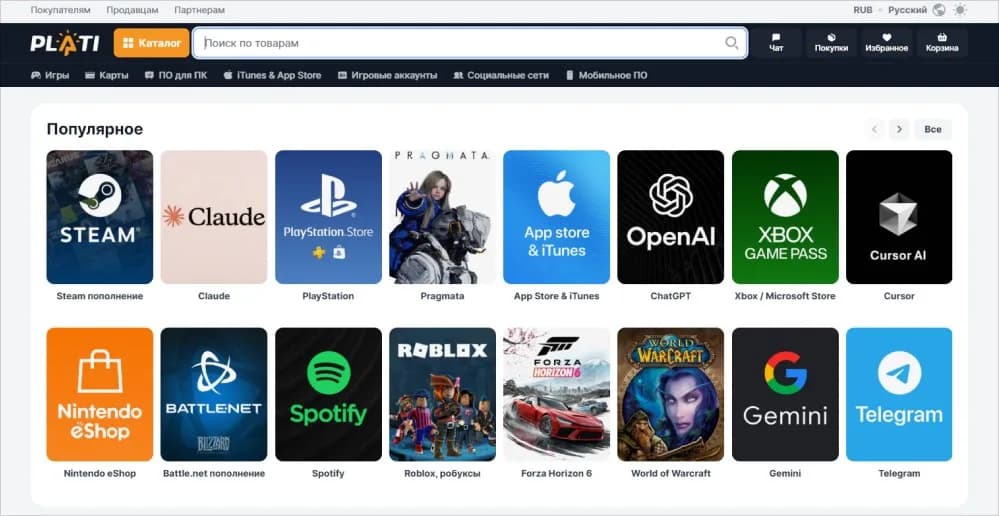 Plati.market — более крупная площадка с широким выбором продавцов. Здесь важно выбирать продавцов с высоким рейтингом и большим количеством продаж.