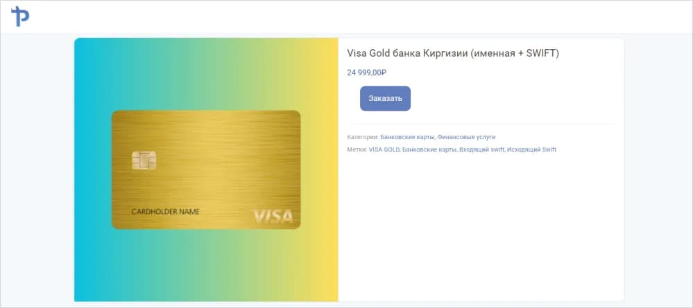 - Карта Visa Gold банка Киргизии — именная физическая карта уровня Gold от киргизского банка, оформляемая удаленно по скану российского паспорта, с доступом к Google Pay и поддержкой SWIFT-переводов.