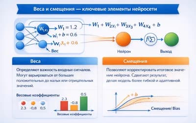 Таким образом веса и смещения — ключевые элементы, определяющие поведение нейросети. Они позволяют системе адаптироваться к данным и улучшать результаты работы.