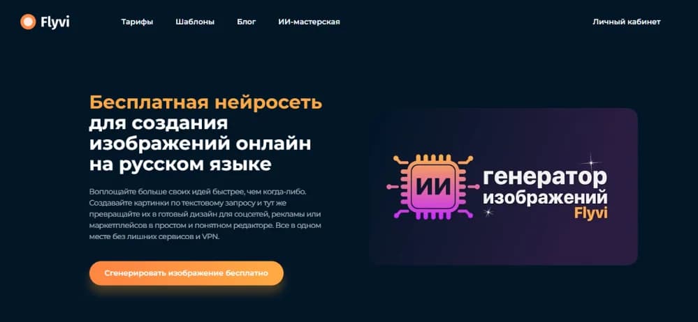 - Flyvi — российский редактор со встроенным генератором изображений, который закрывает полный цикл производства контента: от текстового запроса — до готового баннера, публикации или рекламного макета в одном окне.