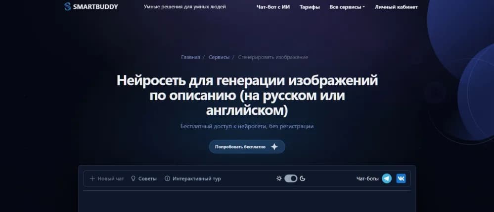 - SmartBuddy — многофункциональная российская платформа с доступом к более чем 120 нейросетям без регистрации для первых трех запросов и с щедрым стартовым бонусом после создания аккаунта.
