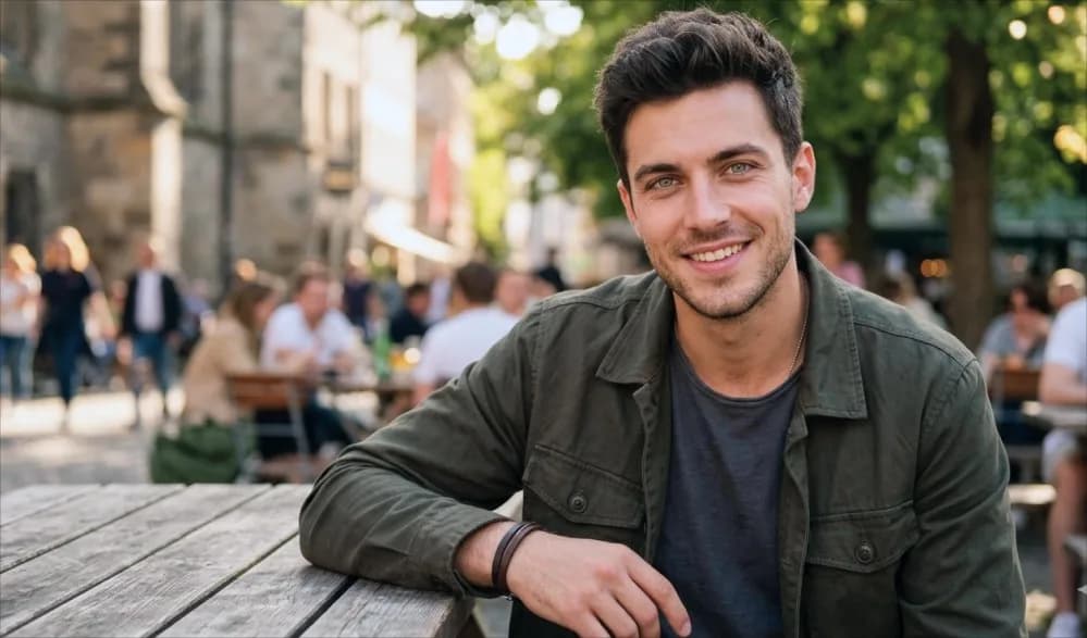 «Портрет привлекательного молодого мужчины, 28 лет, темные волосы, зеленые глаза, уверенная улыбка, повседневный стиль одежды, естественное освещение, фотореализм, высокое качество».