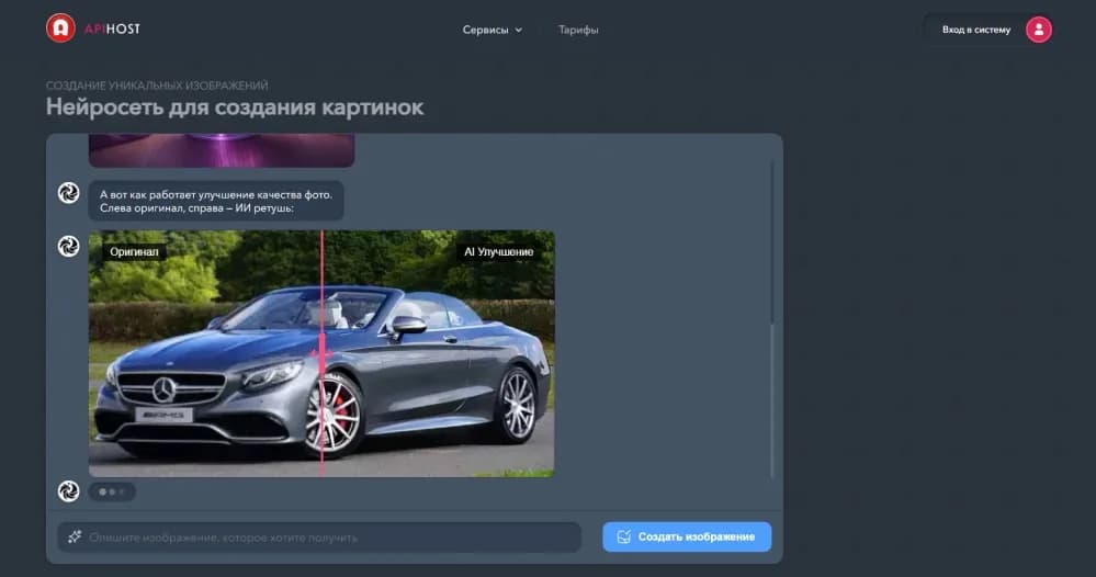 - Apihost — платформа с простым и понятным интерфейсом, которая объединяет генерацию изображений по тексту, точечное редактирование через маску и встроенный модуль повышения разрешения.
