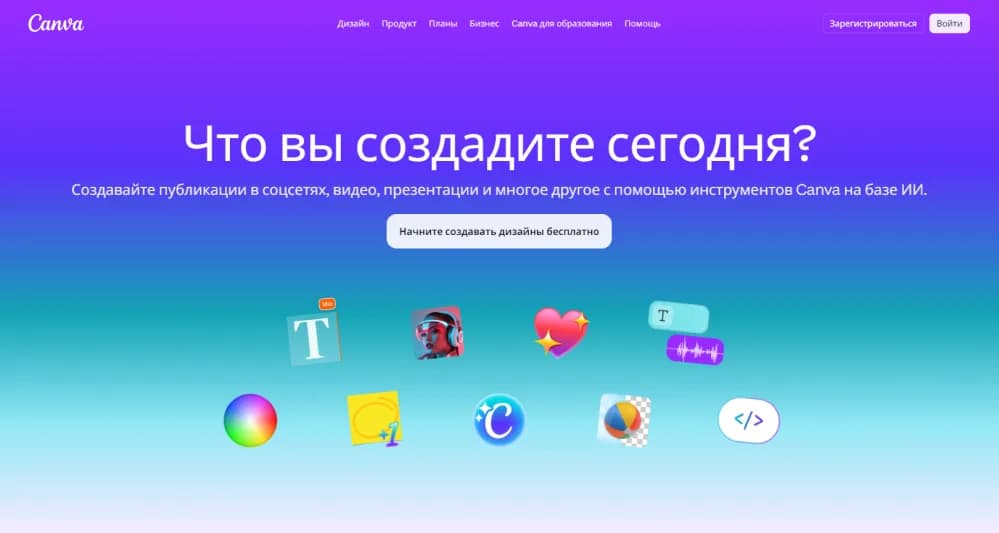 - Основные возможности: генерация изображений по текстовому описанию с выбором стиля; встроенный редактор с фильтрами и эффектами; удаление фона одним кликом; библиотека из 60 000+ шаблонов; 600+ шрифтов; библиотека из 400 000+ элементов; инструмент «Брендбук» для фирменного стиля; планировщик публикаций в социальные сети; экспорт в разных форматах.