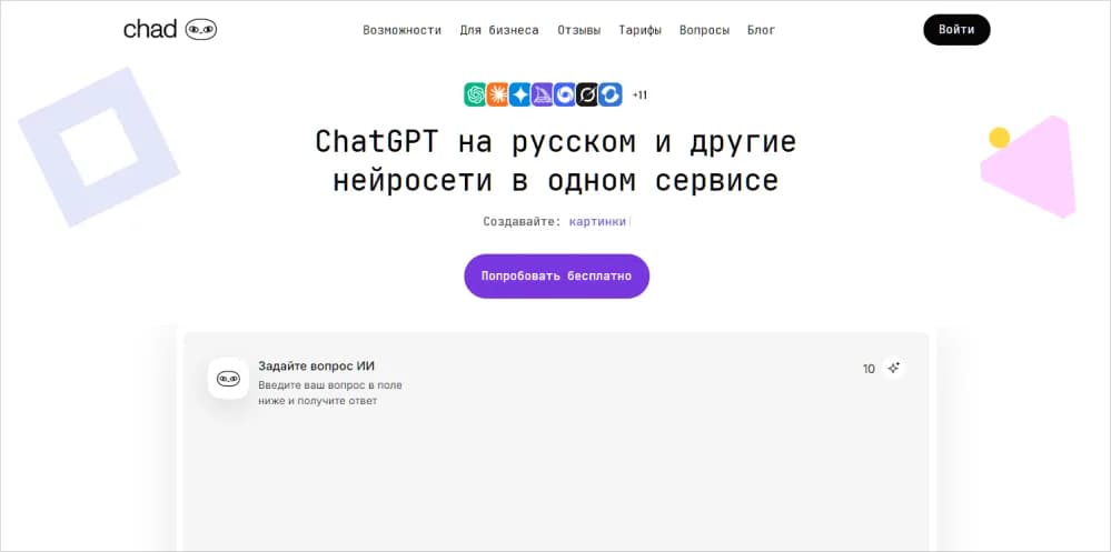 - Chad AI — агрегатор нейросетей, объединяющий несколько AI-инструментов для создания изображений, текста и других материалов, которые можно использовать в поздравительных и креативных задачах.