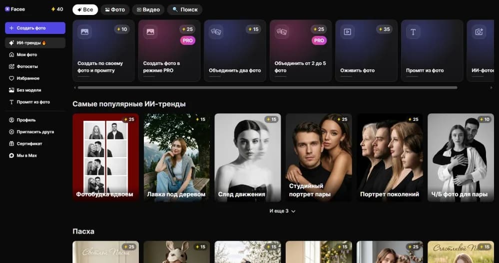 - Facee — специализированный сервис для создания ИИ-фото и праздничных открыток на основе загруженного снимка.