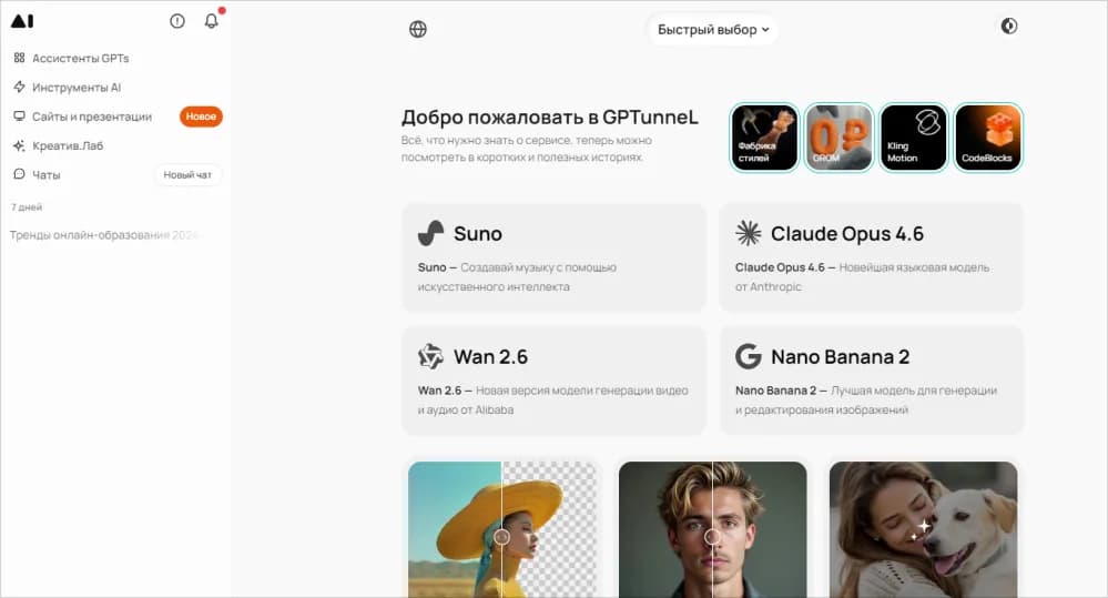 - Основные возможности: генерация текста, изображений, видео и аудио, доступ к более чем 100 нейросетям, а также инструменты для обработки изображений, включая улучшение качества и удаление фона.