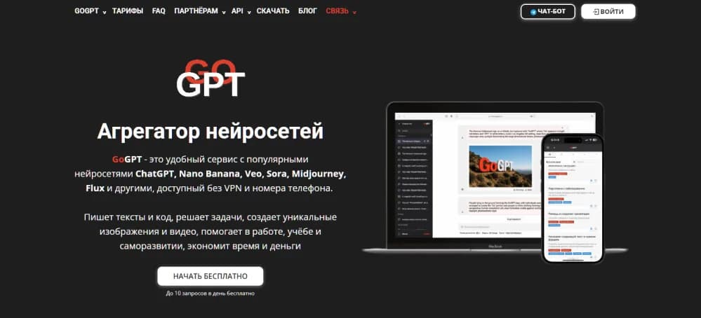 - GoGPT — агрегатор нейросетей с удобным интерфейсом на русском языке, внутри которого можно найти инструменты для генерации изображений и других задач.