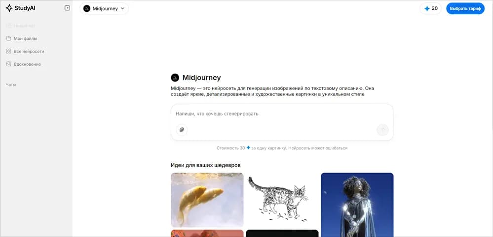 - Study AI — русскоязычный агрегатор нейросетей с поддержкой генерации изображений через специального бота от платформы или встроенных популярных нейросетей.