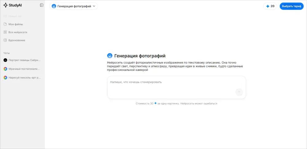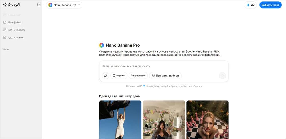 Платформа подходит для всего спектра задач с искусственным интеллектом, и в части генерации изображений это действительно ощущается на практике. Здесь собраны лучшие инструменты для создания открыток и снимков, и переключаться между ними можно прямо в чате. Особенно удобно, что система использует внутреннюю валюту — энергию — и всегда видно, сколько тратишь на каждый запрос. Интерфейс полностью на русском языке, регистрация через Яндекс, Гугл или ВКонтакте.