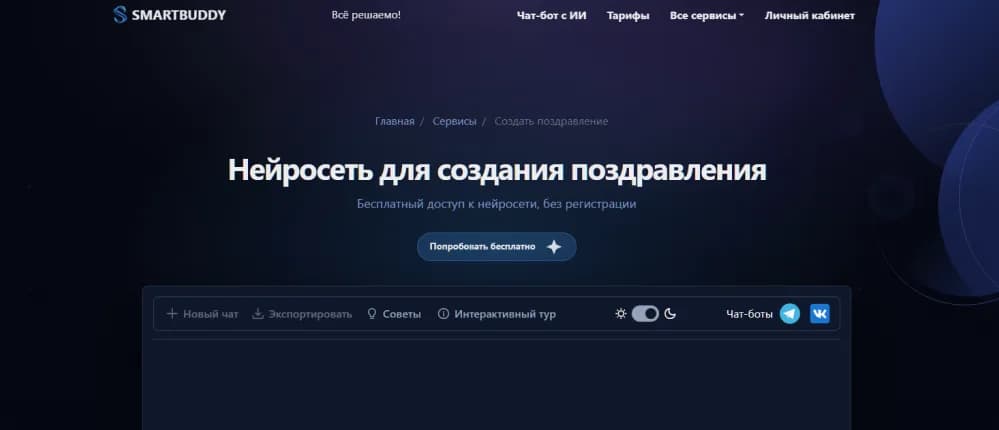 - SmartBuddy — нейросеть для создания поздравительного текста в нужном стиле и тоне; также внутри есть доступ к более чем 120 нейросетям, включая Midjourney, Flux во всех версиях, Nano Banana, GPT Image и Recraft.