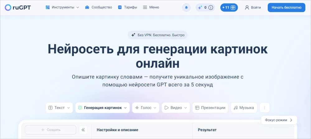 Русскоязычный веб-сервис, который предоставляет доступ к нейросетям вроде GPT и DALL-E в одном интерфейсе. Платформа позиционируется как «чат с ИИ на русском», но при этом дает возможность не только переписываться с моделью, но и генерировать изображения по текстовому описанию, в том числе для открыток и визуального контента. Интерфейс максимально упрощен: достаточно выбрать режим (чат или картинки), сформулировать запрос на русском языке и получить результат за несколько секунд.