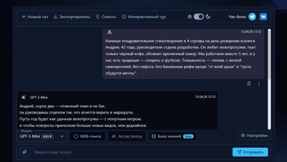 Российский агрегатор с аудиторией свыше 1 миллиона пользователей, объединяющий 50+ нейросетей в одном интерфейсе с оплатой российскими картами. Для генерации поздравлений сервис особенно удобен тем, что позволяет задать стилистику речи прямо в промпте: официальный тон для партнера, шутливый — для друга, трогательный — для близкого человека. Достаточно описать повод, получателя и желаемый стиль — нейросеть выдаст несколько готовых вариантов за секунды. Регистрация занимает меньше минуты через Яндекс, VK, Google или Mail.ru, а бесплатный доступ позволяет попробовать сервис без привязки карты.