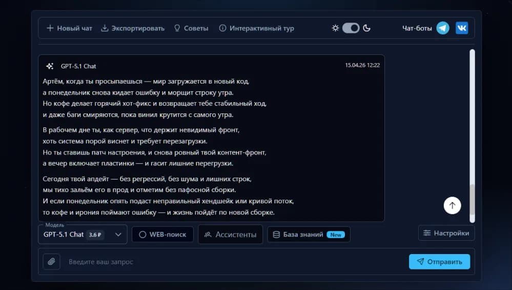 Причина третья — скорость и гибкость. Нужен короткий тост на свадьбу? Развернутое стихотворение на юбилей директора? Поздравление с тонким юмором для лучшего друга? Все это — вопрос нескольких секунд и правильно сформулированного запроса.