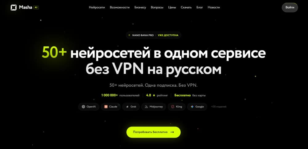 | MashaGPT | ❌ Нет | ✅ Да | ✅ Да | ✅ Да | ✅ Да | ✅ Midjourney, Flux |