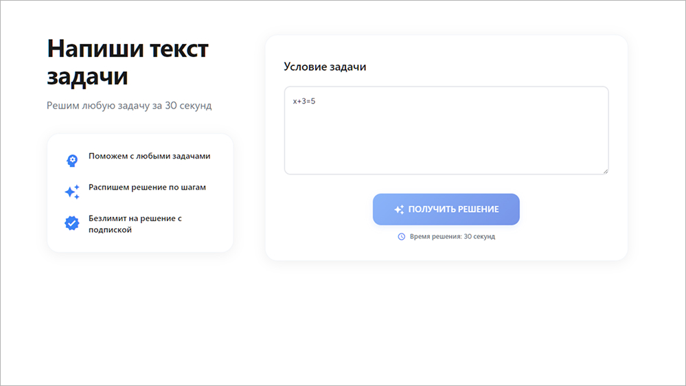 - Решает задачи любой сложности с подробными объяснениями за 30 секунд