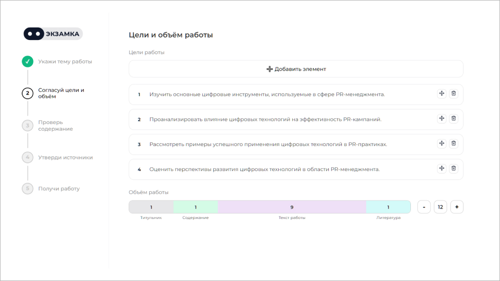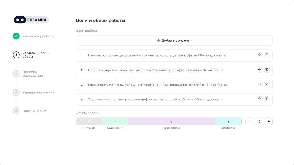 - Уточнение целей и объема вводной части. На основе темы система предлагает варианты формулировок задач исследования, которые можно откорректировать вручную по тону или объему.