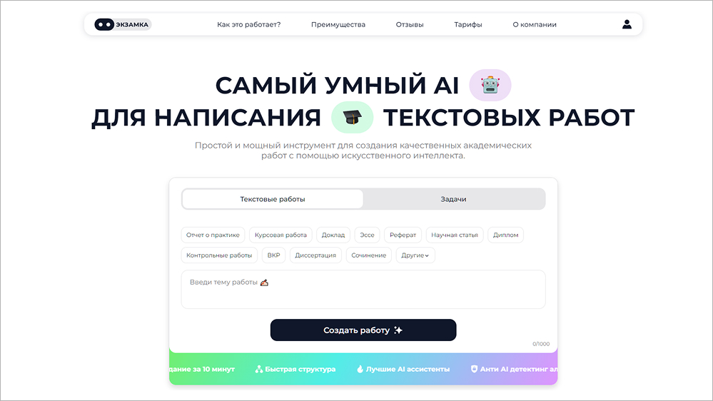 Экзамку удобнее всего рассматривать как инструмент для помощи в поэтапной подготовке учебных материалов. Сначала сайт применяют для формирования плана или тезисной структуры. Это помогает быстро задать логику будущей работы и понять, в каком направлении двигаться дальше.