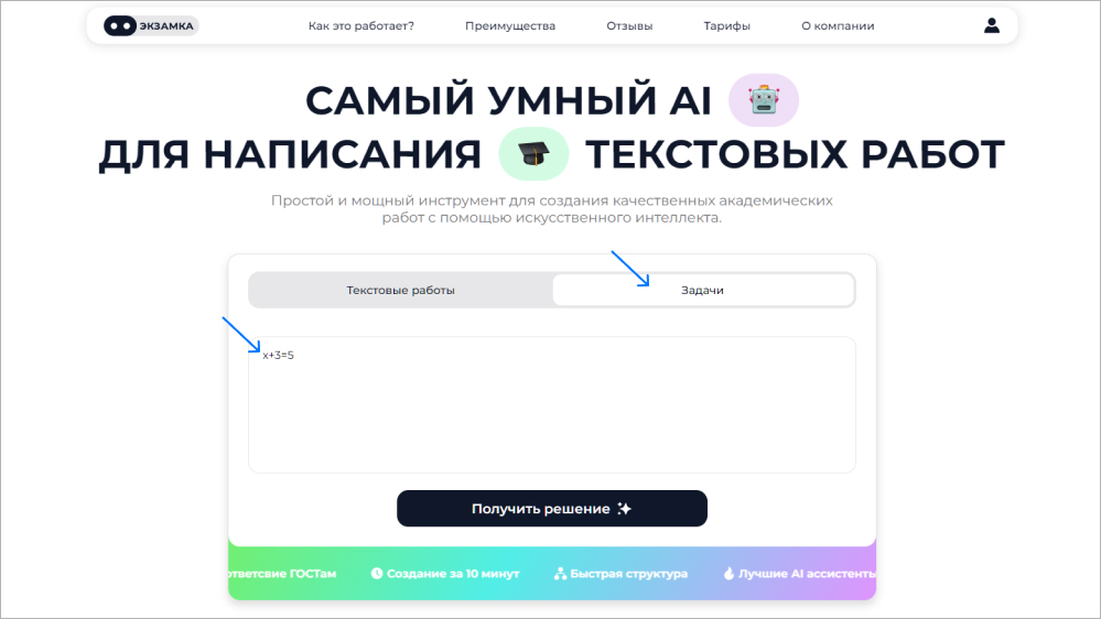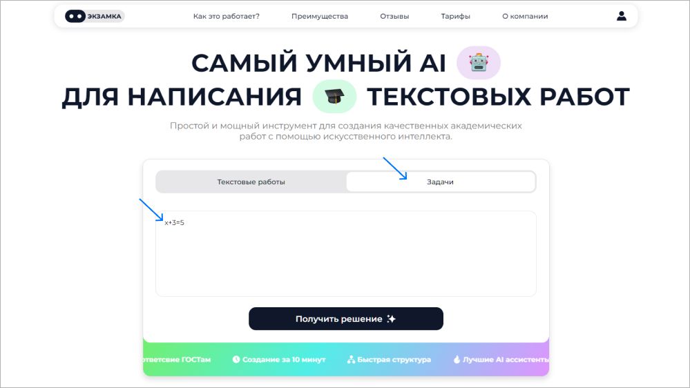 У Examka два основных направления: помощь в написании текстовых черновиков и в решении задач.