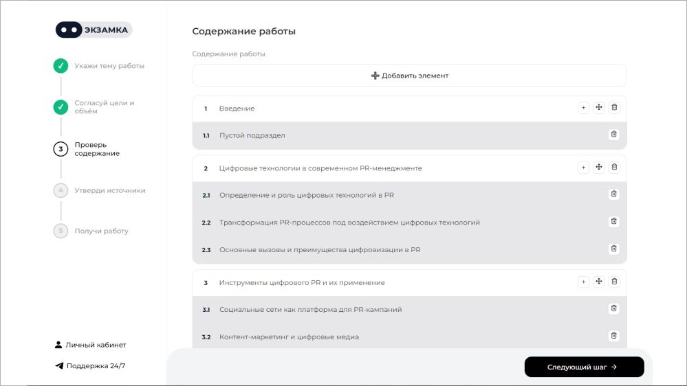 - Согласование содержания. Examka предлагает краткие формулировки для каждого пункта плана: что именно будет рассмотрено в разделе, какие аргументы и материалы в них могут быть.