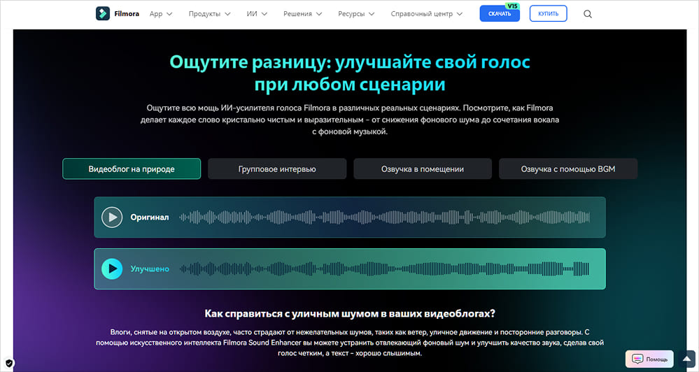 Очищает аудиодорожку от посторонних звуков (ветер, гул, шум улицы) или полностью изолирует вокал/речь от музыки — качество заметно улучшается за один клик.