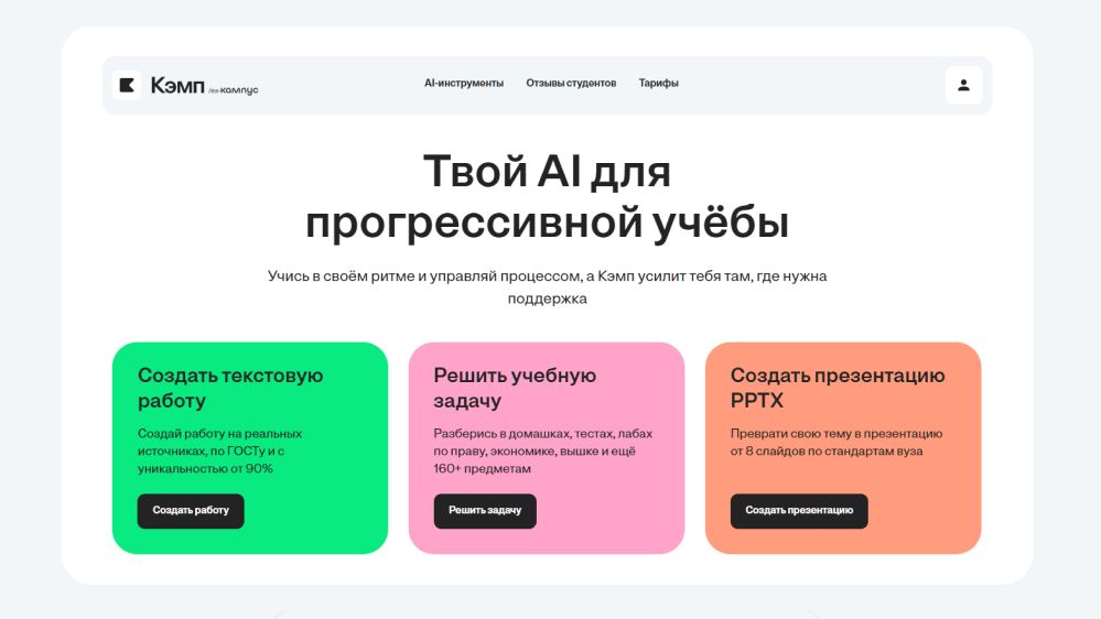 У сайта стильный минималистичный интерфейс. На главной странице — основные направления: помощь в создании работы, в решении задачи и в подготовке презентации — без лишних шагов и отвлечения внимания. Кнопки действий крупные, яркие и подписаны понятными формулировками, а ключевые инструменты доступны в один‑два клика, что снижает порог входа для новых пользователей.