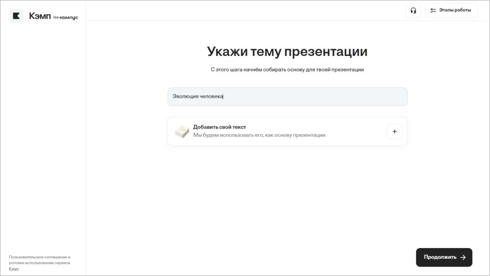 Пользователь вводит тему и желаемый объем слайдов, а Кэмп готовит черновик для каждого слайда, при этом подбирая источники литературы и электронные ресурсы. Учащийся редактирует текст, меняет порядок слайдов и добавляет визуальные элементы. В итоге сайт готовит основу для презентации, а студенту остается доработать черновой вариант под личный стиль и требования преподавателя.