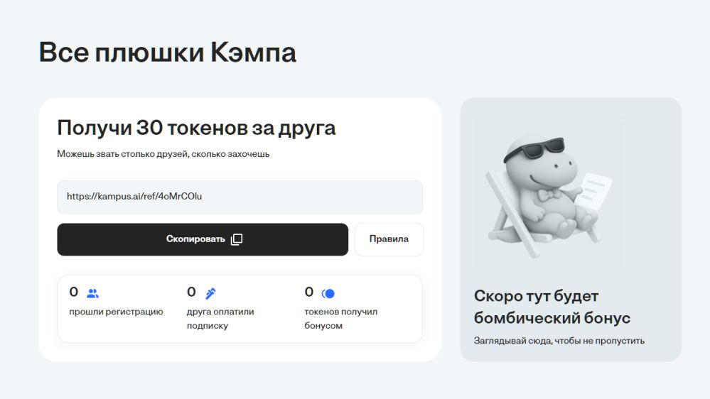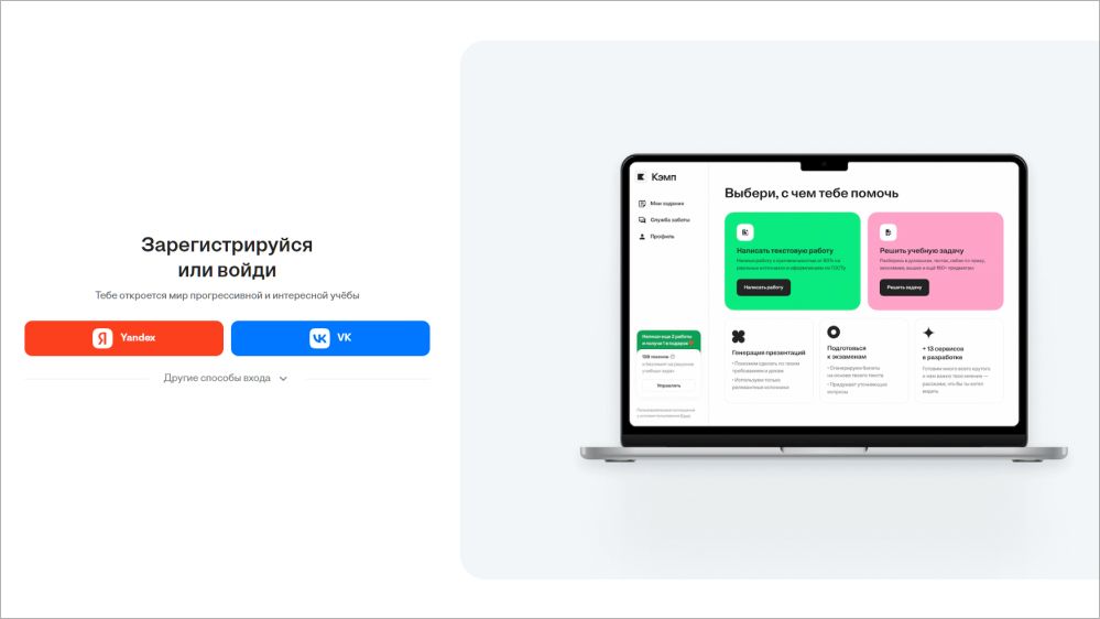 Пользоваться Кэмпом можно после того, как вы создали аккаунт на сайте или в Telegram. Регистрация открывает доступ к справочным материалам, помощи с задачами и генерации черновиков.