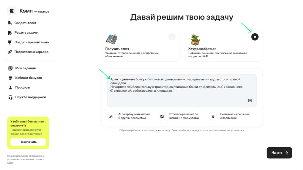 Кэмп используют, когда дедлайн уже близко, а руки даже до черновика еще не дошли. Этот сервис на базе ИИ хорошо показывает себя на том этапе, когда нужно быстро разобраться в теме и разложить требования преподавателя по полочкам. С нейросетевым помощником можно сэкономить время на подготовке письменных заданий и ответов на экзаменационные билеты. Однако основная работа над любым учебным проектом все же возлагается на плечи учащегося.