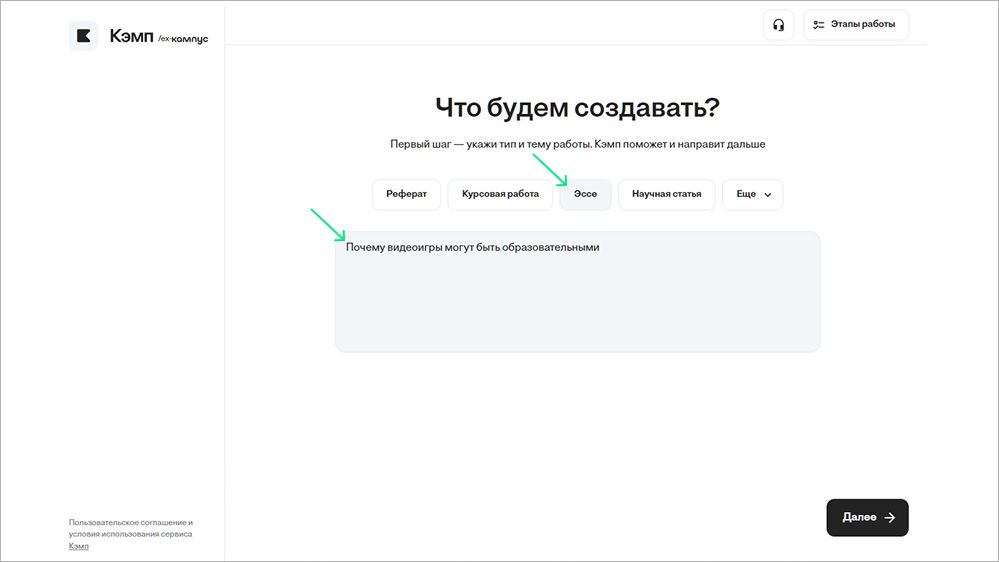 Допустим, студент пишет эссе. Сначала он формулирует тему, указывает область исследования и основные требования к работе в Кэмпе. Нейросеть анализирует запрос и предлагает структуру: введение, основные аргументы и заключение. Далее ученик получает черновой текст с идеями и пояснениями, корректирует формулировки и добавляет собственные мысли. В финале сервис помогает проверить текст на ошибки и оформить цитаты по ГОСТу, создавая основу для окончательной работы.