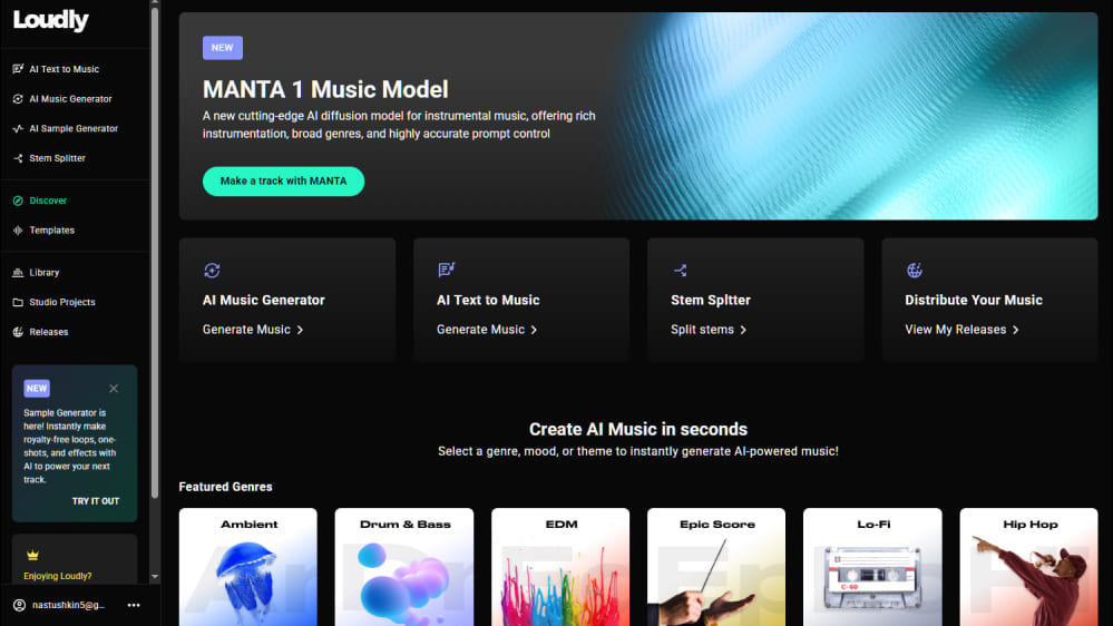 «Лаудли» — это прорыв для тех, кто хочет быстро получать профессионально звучащую музыку без сложных программ и специальной подготовки. Loudly закрывает сразу такие потребности, как создание музыкального фона для видео и полноценный релиз трека. Даже на бесплатном аккаунте за пару минут легко понять принцип работы с ИИ. Главное — эксперименты с описаниями и параметрами, тогда результат приятно удивит. «Лаудли» продолжает развиваться: недавно добавили продвинутый Stem Splitter для разделения треков на чистые дорожки и новый Sample Generator для создания собственных лупов и эффектов — это открывает еще больше возможностей для микса в DAW.