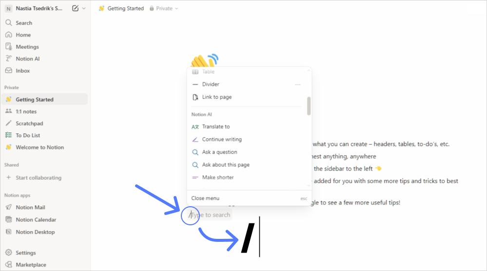 Чтобы начать работу с ИИ-ассистентом, достаточно открыть любой блок рабочего пространства после регистрации и вызвать помощника через слэш-команду или кнопку AI. Дальше — описываете задачу естественным языком.