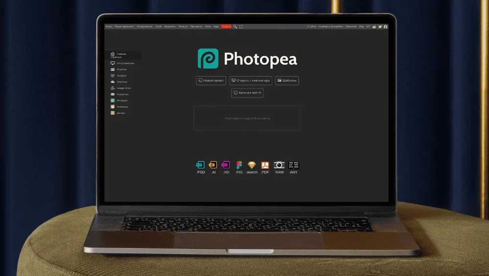 Photopea — это графический редактор в браузере, который позволяет создавать и редактировать изображение по принципам, близким к работе в Photoshop: со слоями, масками, выделениями и экспортом в разные форматы.