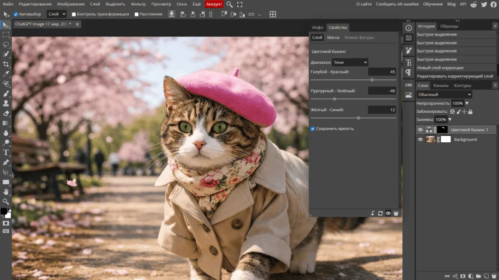 Photopea выручает там, где нужен привычный «фотошопный» результат, но под рукой нет установленной программы: вы открываете сайт и сразу видите рабочее пространство со слоями, панелями и горячими клавишами. Важная деталь, о которой знают не все: Photopea умеет работать с проектами так, чтобы сохранялась структура макета — слои, эффекты, маски и многие параметры остаются редактируемыми, а не «сплющиваются» в одну картинку. Поэтому сервис подходит для аккуратной подготовки файлов к передаче в печать или в команду.