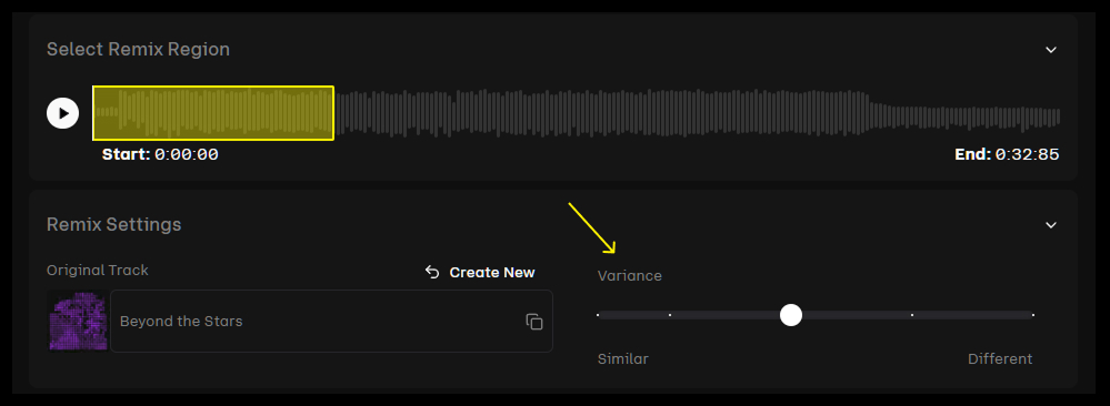 - Ремиксы и жанровые трансформации. Функция Remix дает возможность переработать уже созданный материал. Ползунок Variance регулирует степень изменений: от легкой стилистической коррекции до заметной смены жанра и звучания.