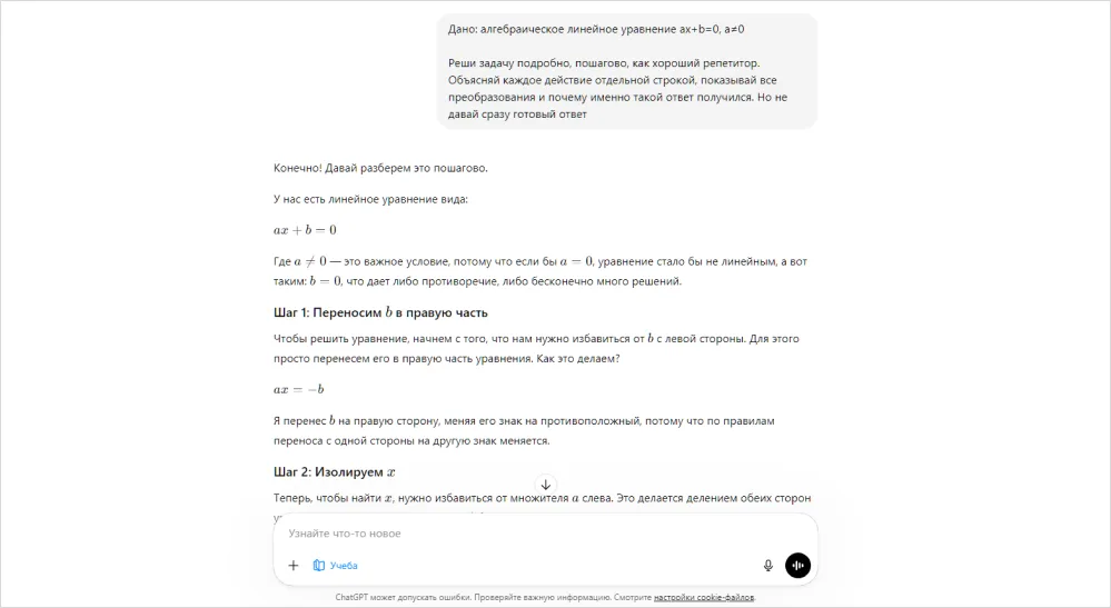 Именно в точных науках разрыв между алгоритмом и живым педагогом наиболее заметен. ИИ-репетитор по математике не просто выдает правильный ответ, а ведет тебя по решению шаг за шагом, останавливаясь ровно там, где ты споткнулся. Попробуй попросить его объяснить задачу по-другому, без формул, через аналогию с деньгами или скоростью, и он сделает это мгновенно.