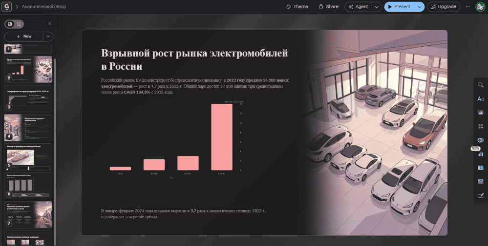 Кликнете на нее и напишете естественный запрос на русском или английском: «Сделай презентацию о рынке электромобилей в России на 12 слайдов, с акцентом на данные таких-то годов, используй корпоративные цвета компании и добавь инфографику».