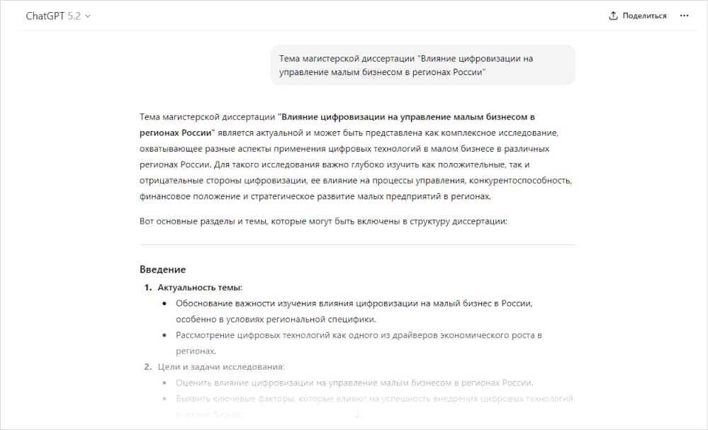 - Старт — формулировка темы, гипотезы и научного аппарата. На самом первом этапе ИИ для написания магистерской диссертации помогает превратить расплывчатую идею в четкую постановку. Вы даете краткое описание темы (например: «Влияние цифровизации на управление малым бизнесом в регионах России»), и нейросеть предлагает 5–10 вариантов гипотезы исследования, цели, задач, объекта/предмета, новизны и практической значимости. Я использовал промпт: «Сформулируй 3 варианта гипотезы для магистерской по [тема], с обоснованием актуальности и ссылками». Так я получил готовые формулировки, выбрал одну и дорабатывал под требования вуза. Это дало сильный каркас для введения.